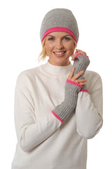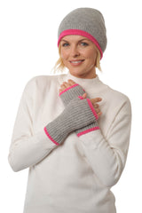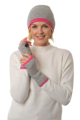 Cashmere Merino Beanie hat - Jersey Knit - Coloured Trim - Flannel Grey & Fuschia Pink