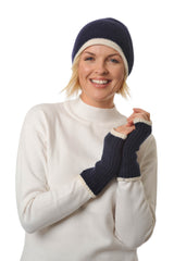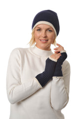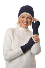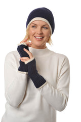 Cashmere - Merino Fingerless Glove - Wrist-warmers with Coloured Trim - Navy Blue & Ivory